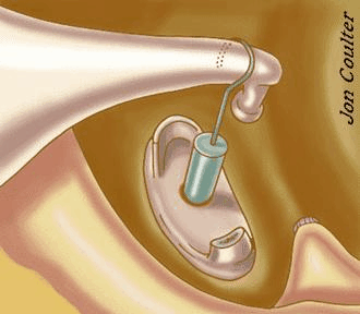 un premier type consiste en la fixation de la platine de l'étrier dans la fenêtre ovale ;