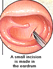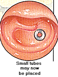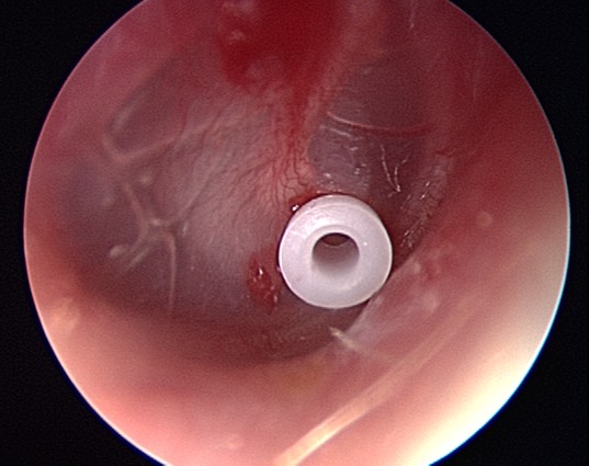Un très petit tube de ventilation de l'oreille est introduit dans le tympan pour permettre le drainage du fluide et empêcher parfois le retour d'infections.